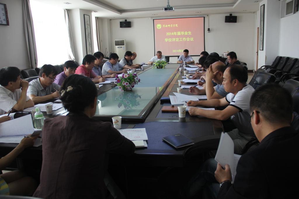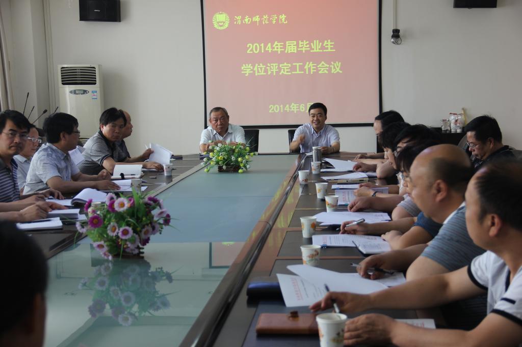 2014年6月12日上午,我校2014届毕业生学位评定工作会议在厚德教3楼会议室顺利召开,渭南师范学院学位评定委员会委员共23人出席会议,会议由丁德科院长主持。