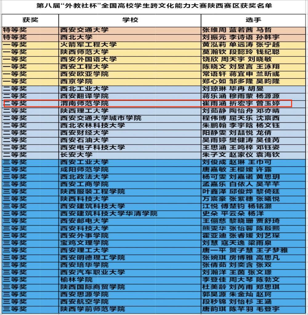 10月19日,第八届“外教社杯”全国高校学生跨文化能力大赛陕西赛区比赛在西安石油大学圆满落幕。我校派出由外国语学院郝嘉亮、卢峰、孙莹三位教师共同指导,外国语学院学生崔雨涵与人文学院学生折宏宇、曾玉婷联合组成团队。该团队凭借扎实的跨文化知识、出色的沟通技巧及默契的团队协作在比赛中荣获省级二等奖。
