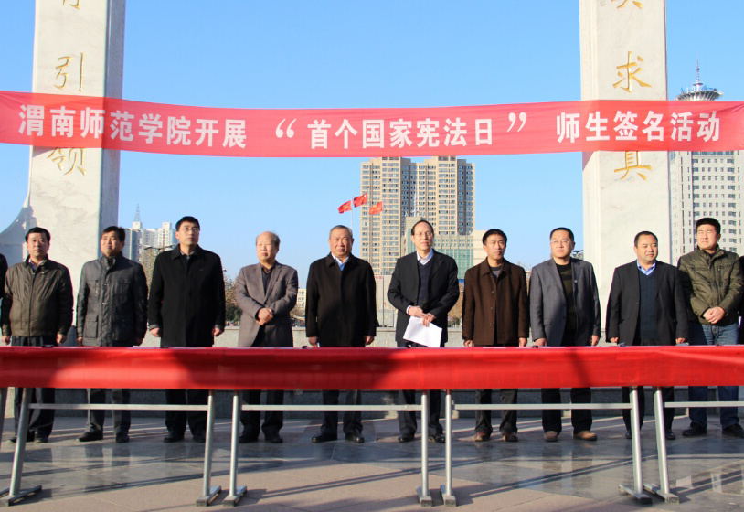 活动中,我校教育与公共管理学院思想政治教育专业2012级陶沙同学代表学生发言;党委副书记赵伏友研究员作了重要讲话,他指出:国家宪法日的设定是一种制度建设,也是一项文化建设。这样的宪法纪念日主要用于改变我们的观念,树立宪法权威,弘扬宪法精神,增强全社会的宪法意识,最终在全社会形成一种尊崇宪法、活用宪法、将宪法融入到现实生活的宪法文化。并希望大学生一是自觉接受宪法教育,做学习宪法的先行者;二是自觉宣传宪法知识,做普及宪法的宣传者;三是自觉服从宪法权威,做遵守宪法的践行者。四是自觉弘扬宪法精神,做宪法文化的传播者。党委书记张金安研究员宣布渭南师范学院开展“首个国家宪法日”师生签名及系列活动启动。