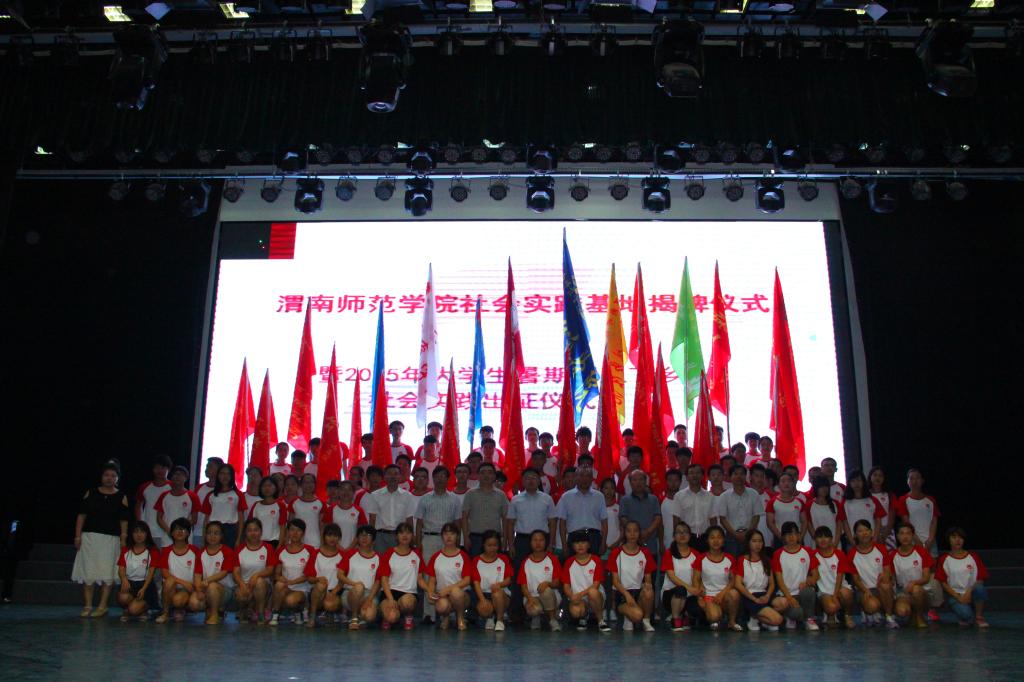7月14日上午,渭南师范学院社会实践基地揭牌仪式暨2015年大学生暑期“三下乡”社会实践出征仪式在陶然楼演艺厅隆重举行。校党委书记张金安,党委副书记赵伏友,学工部部长王俊安,教务处处长李尧龙,渭南市团市委书记王宏强,临渭区团委书记李永辉、华县团县委书记张凯出席了本次活动,各二级学院团总支书记和实践团队成员300余人参加仪式。活动由校团委书记姚明亮主持。