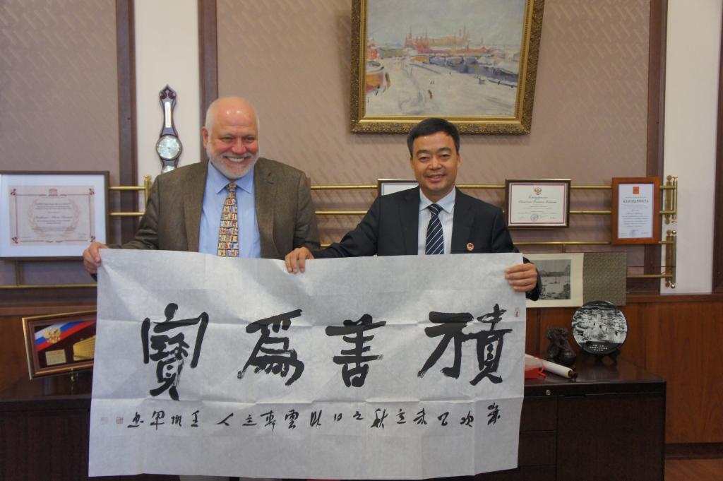 创办“俄中艺术师范大学”协议由两校校长于莫斯科时间8月25日上午10时许签署。丁院长率领代表团到达莫师大中心校区,中国驻俄罗斯大使馆教育处教育参赞赵国成、我校校长顾问、兼职教授、北京枫华艾蒂克集团公司董事长魏新民同日到达。莫师大副校长多芩科·康斯坦丁·彼得洛维奇和有关工作人员以俄罗斯人最高的民族礼节---捧出“面包和盐”迎接客人。代表团首先参观莫师大中心校区,在讲解员的导引下,参观了莫师大行政楼、教学楼,听了简约清晰的讲解。
