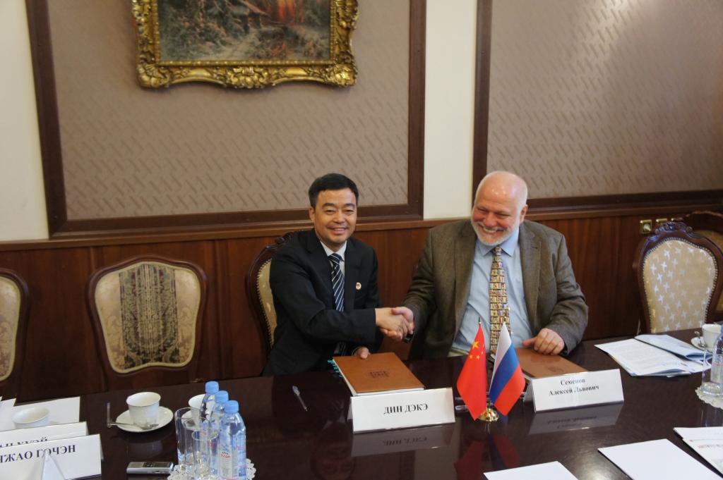 在融洽热烈的气氛中,俄罗斯莫斯科国立师范大学校长阿列克谢模·利奥维奇·谢苗诺夫与渭南师范学院丁德科院长签署创办“俄中艺术师范大学”协议。教育参赞赵国成、北京枫华艾蒂克集团公司董事长魏新民和双方人员,见证了这一创办俄中艺术师范大学,为丝绸之路经济带切实贡献、开创未来的时刻。