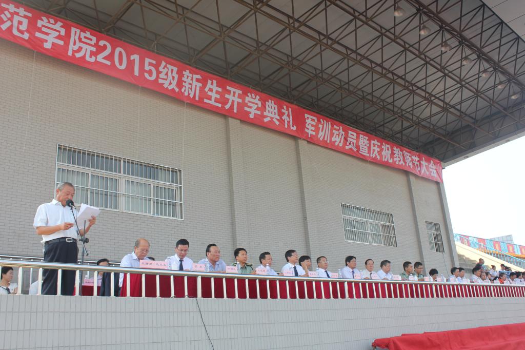 9月7日下午,我校在田径场隆重举行2015级新生开学典礼、军训动员暨庆祝教师节大会。市委常委、宣传部长潘洁,军训团团长、驻渭某部副站长霍伟华,我校党委书记张金安,院长、党委副书记丁德科,纪委书记任健,副院长程书强、李海龙,党委委员杨小渭出席大会。参加大会的还有学校各部门负责人、党总支书记、二级学院院长,部分教师代表及2015级全体新生。大会由校党委副书记赵伏友主持。