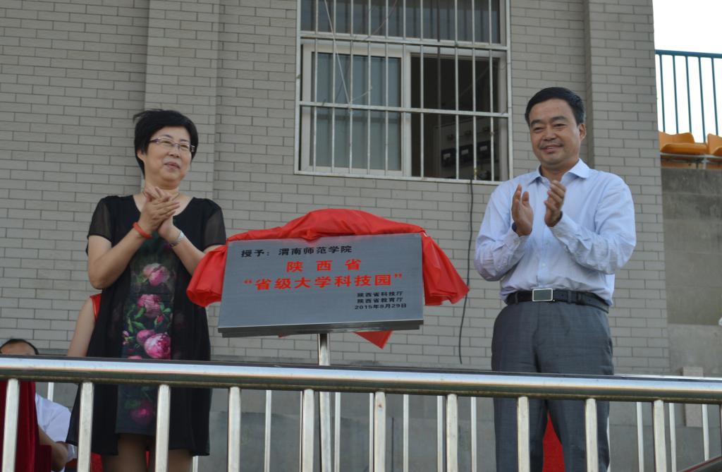 9月7日下午,在我校2015年开学典礼暨庆祝教师节大会上,我校院长丁德科教授和渭南市委常委、市委宣传部部长潘洁为“省级大学科技园”揭牌,副院长李海龙教授宣读陕西省科技厅、教育厅省级大学科技园认定文件,标志着我校大学科技园正式跻身“省级大学科技园”行列,成为陕西省属普通院校中首家“省级大学科技园”,也成为秦晋豫黄河金三角区域唯一的“省级大学科技园”。