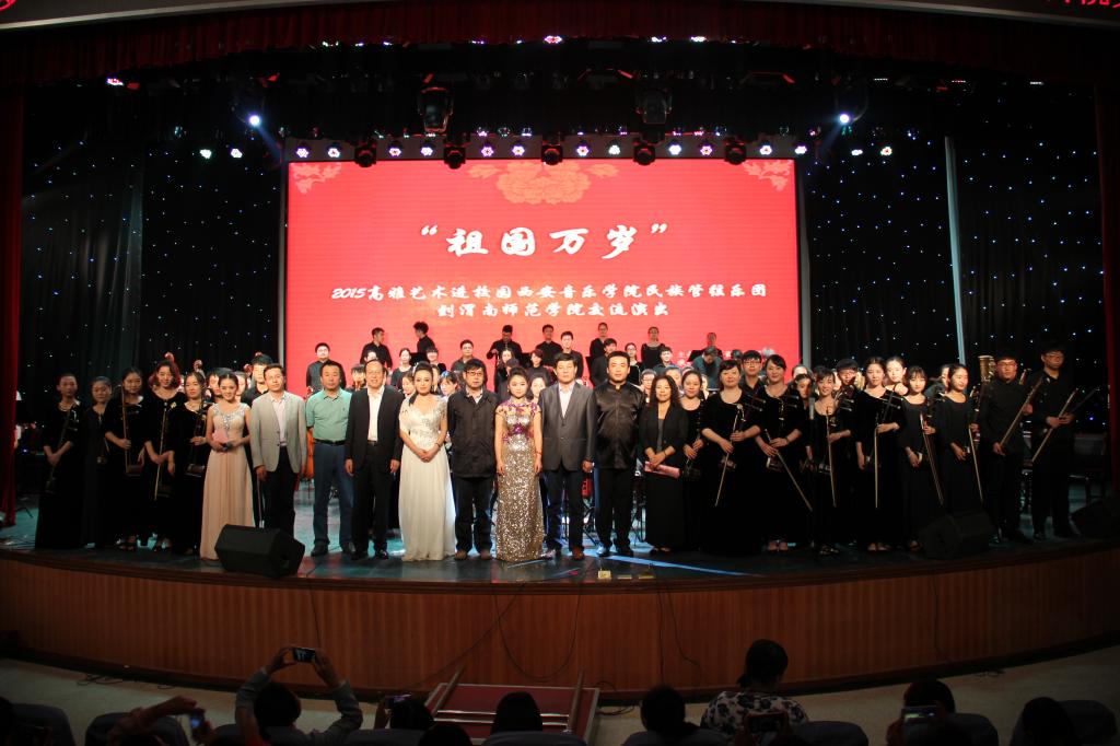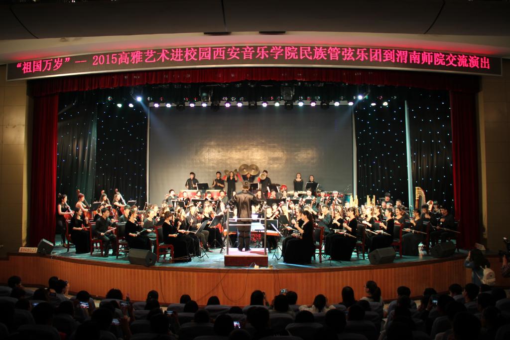 9月29日,我校举行以“祖国万岁”为主题的迎国庆系列活动,特邀西安音乐学院民族管弦乐团来校交流演出,这既是我省2015年高雅艺术进校园活动的重要演出,也是我校喜迎国庆66周年系列重要活动。学校纪委书记任健,副校长程书强,副校长李海龙、党委委员、组织部部长杨小渭,西安音乐学院艺术处处长刘宝玲,民乐系副主任高晓鹏,民乐团团长赵鸿宾出席活动,学校各部门、院系领导领导、学生代表300余名观看演出。
