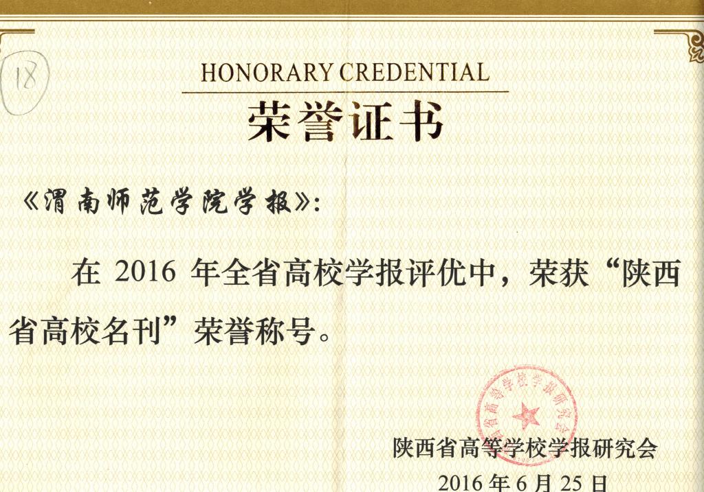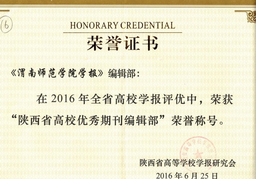 2016年6月30日至7月1日,陕西省高等学校学报研究会2016年学术年会在延安举行。会议公布了陕西高校学报研究会“四优评比”结果,《渭南师范学院学报》首次进入“陕西省高校名刊”序列,并取得了陕西高校学报优秀编辑部、优秀主编、优秀编辑、优秀编辑学论著共10项荣誉。本次评比在参评的百余家高校学术期刊中评选出“陕西省高校名刊”共18家,其中高校社科学报9家,是陕西高校学报队伍的第一梯队。《渭南师范学院学报》是“陕西省高校名刊”方阵中唯一一家地方院校主办的高校学术期刊。