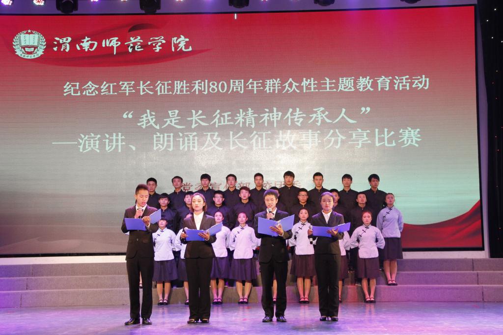 为纪念红军长征胜利八十周年,引导广大师生缅怀革命烈士,追忆红色足迹,传承长征精神,10月18日晚,由校党委宣传部、校团委组织开展的渭南师范学院纪念红军长征胜利八十周年群众性主题教育活动——“我是长征精神传承人”演讲、朗诵及长征故事分享比赛在陶然楼演艺厅举行。校党委副书记赵伏友、纪委书记任健、副校长李海龙、校长助理韩小卫、宣传部部长杨利民,各二级学院党总支书记、副书记,分团委、团总支书记及400余名学生代表参加了此次活动。机关一总支书记焦锁囤、学工部部长王俊安、评估办主任王炳社、新闻中心主任王双明、统战部部长张红英、人武部部长崔启、组织部副部长董康军担任评委。