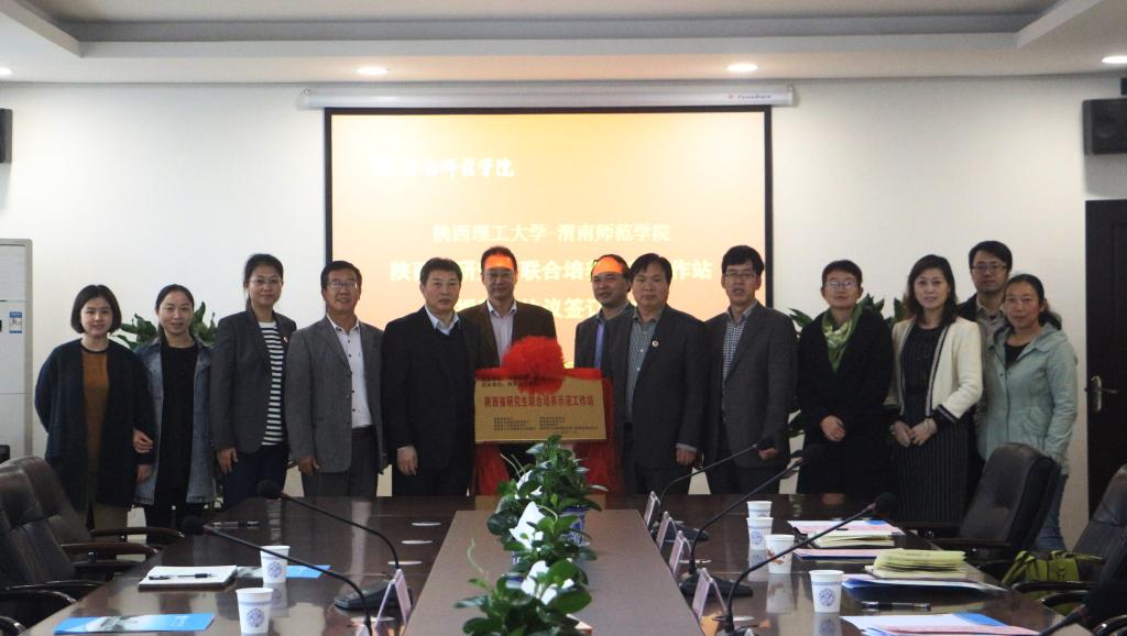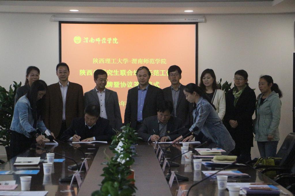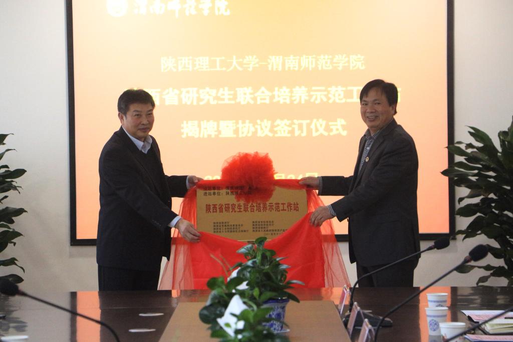 陕西理工大学傅校长、渭南师范学院李校长共同签署了《陕西理工大学—渭南师范学院联合培养硕士研究生协议》,并为陕西理工大学与渭南师范学院共建的“陕西省研究生联合培养示范工作站”揭牌。