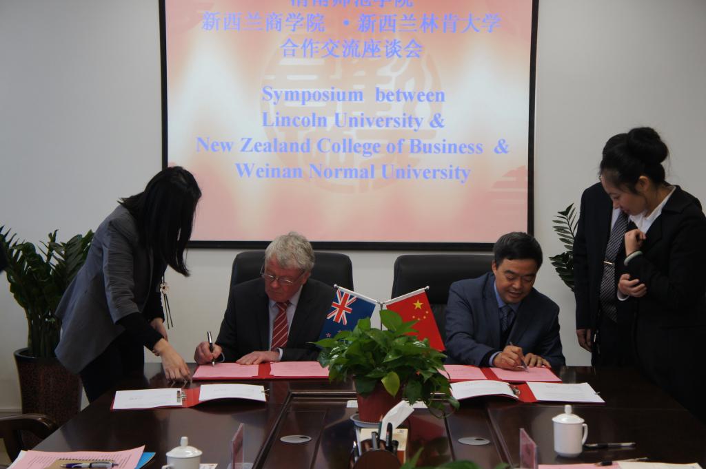 此次新西兰商学院董事长一行到访。双方主要商讨了国际商科人才联合培养、3+1+1本升硕项目合作,希望借助中新两国友好合作的大环境,以人才培养为目标,搭建双边合作平台,为学生出国深造、师生互访和科研合作等创造良好的契机。新西兰商学院副校长Jack Radford介绍了新西兰商学院2017年的奖学金项目,希望通过奖学金资助学生顺利前往新西兰留学,在林肯大学、坎特伯雷大学、梅西大学感受新西兰的优质教育资源,获得世界500强名校的硕士学位。我校校长对新西兰商学院为促进双边合作帮助学生实现留学梦想,提供2600万奖学金表示赞赏,希望通过双方的共同努力尽快推广合作项目,为同学们出国留学提供更多的机会。经过友好协商,新西兰商学院董事长Jason Ho与渭南师范学院校长丁德科签署了“3+1+1”本升硕合作项目协议。(通讯员 韦宁宁 贺星蓓)