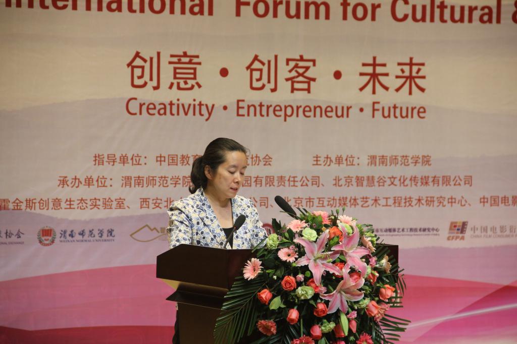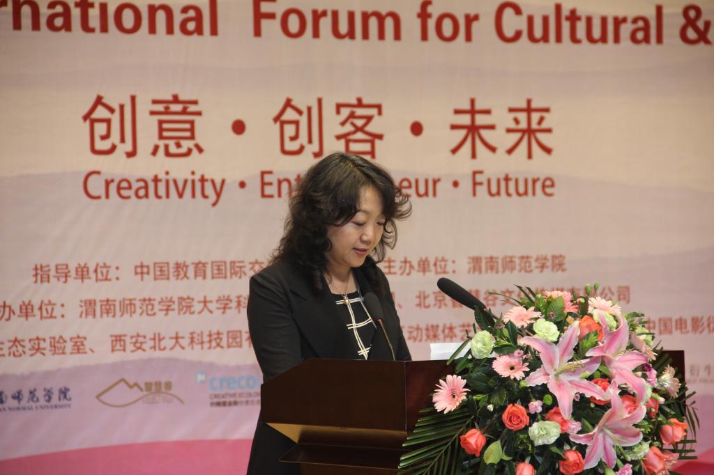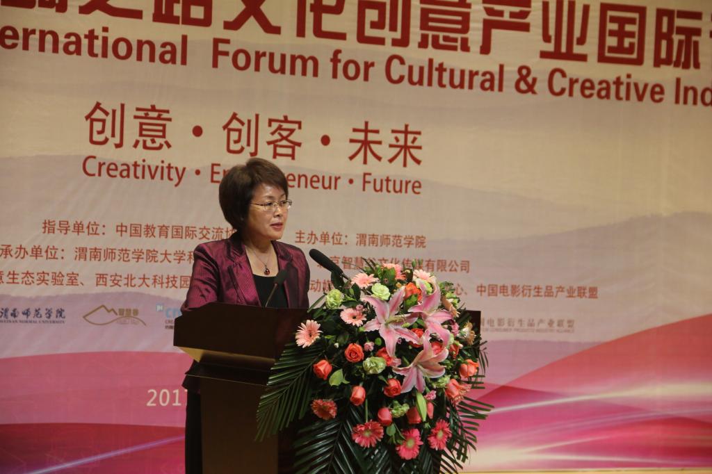 沈雪松在致辞中指出,此次论坛“创意·创客·未来”主题,内含三个维度、三个目标,秉承中国教育国际交流协会文化创意产业分会宗旨,掀起我国大量培养面向国际市场的中国文化创意人才教育高潮,掀起弘扬优秀传统文化、以华夏文化促产业转型的中国创业高峰,掀起校园创意、创新、创造的校园文化新气象。中国金粟山丝绸之路文化创意产业国际论坛,在全球视野下探求中国文化创意产业发展,国家战略视角下唤醒高等院校的文化创意使命,具有特殊的意义和深刻的涵义。她代表中国教育国际交流协会对主办这次论坛的渭南师范学院表示感谢,感谢该校用实际行动走出了中国创意人才教育的第一步。同时,沈雪松向约翰·霍金斯表示崇高的敬意,并预祝此次论坛圆满成功。