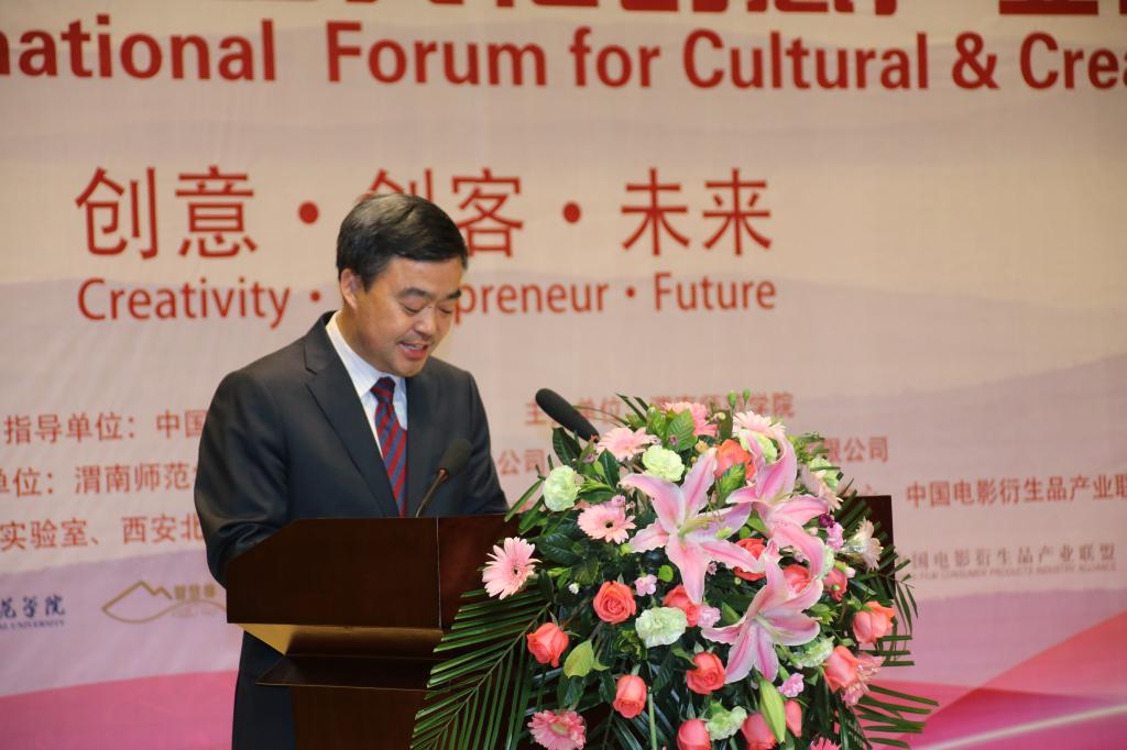 “这次文创国际论坛,是我校响应中国教育国际协会倡议主办、我校大学科技园和北京智慧谷文化传播有限责任公司合作承办。”丁德科院长介绍,举办“中国金粟山丝绸之路文化创意产业国际论坛”的最先建议来自中国教育国际交流协会组织的高校赴英文创考察培训团。培训活动中,会见了约翰·霍金斯先生,同时也形成了举办文创国际论坛的意向,并且明确:文创国际论坛要坚持每年举办,由高校自愿成立的论坛组委会,在中国教育国际文化交流协会指导下做好论坛在全国高校轮流举办的组织工作。经协商,以“中国金粟山”命名,面向“丝绸之路”,明确“文化创意产业”主题,强调“国际论坛”。“金粟山”是陕西渭北乔山山脉上的一座山峰,因为山下在人类早期的“粟时代”盛产“粟”、百姓因“粟”丰安康幸福而得名,在唐代又有了红雁姑娘救民成仙的美好传说而成为文化山。渭南师范学院所在的陕西渭南是金粟山所在地,以“金粟山”命名文化创意产业论坛,是因为首次论坛会议在该校举办,更是为了表达文创及文创产业为民创造真金、创造财富、创造传承、为民的人文血脉、永续作用于人类进步与文明的特质!“丝绸之路”表明文创产业国际论坛立意坚持实施国家“一带一路”战略!