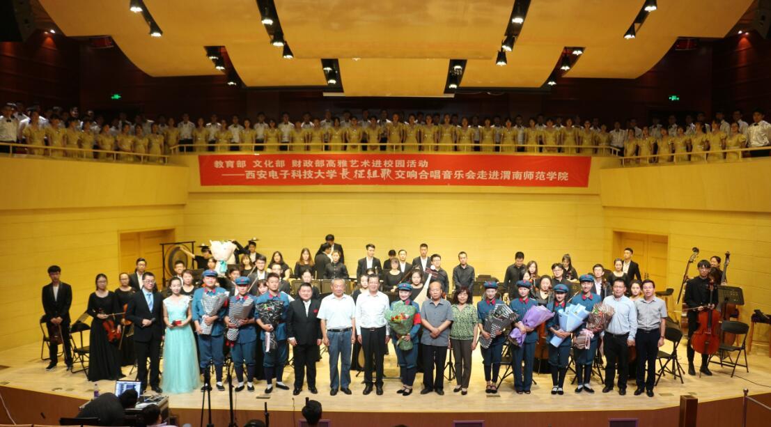 演出在一曲欢快的《轻骑兵序曲》中拉开帷幕,校党委副书记赵伏友作了致辞,他代表学校欢迎演出团队来校演出。并指出西安电子科技大学蜚声国内,名扬海外,各方面的工作是我校学习的榜样,追赶的目标,高雅艺术能激发学生爱祖国、爱人民、爱社会的热情,能陶冶学生们的情操,激发学生创造、创意、创新的思维,希望两校友谊能像高雅艺术之树一般长青。随后,两校领导代表学校互赠礼物。西安电子科技大学党委副书记龙建成代表该校致辞,他介绍了西安电子科技大学交响合唱音乐“长征组歌”的编排过程及取得的成就,他指出渭南师范学院“红色精神”闪耀、革命圣火不息,传承坚定创业创新为核心的渭华照金精神,他表示本次两校共同举办音乐会,不仅是两校文化的交流合作,也是对长征精神的深层次解读,对深化“一带一路”倡议,深化高等教育工作改革产生积极影响,两校将会同心协力为陕西的教育发展做出贡献,为实现中国梦再添动力。“红旗飘,军号响。子弟兵,别故乡。”在激昂的诗朗诵中“长征组歌”交响合唱音乐会正式开始,整个组歌共分为《告别》、《突破封锁线》、《遵义会议放光辉》、《四渡赤水出奇兵》、《飞越大渡河》、《过雪山草地》、《到吴起镇》、《祝捷》、《报喜》和《大会师》10个部分,合唱团以饱满的热情和高超的演奏技艺再现了长征的艰难险阻,为现场观众带来了一场视听盛宴,现场座无虚席,演出过程中掌声不断。