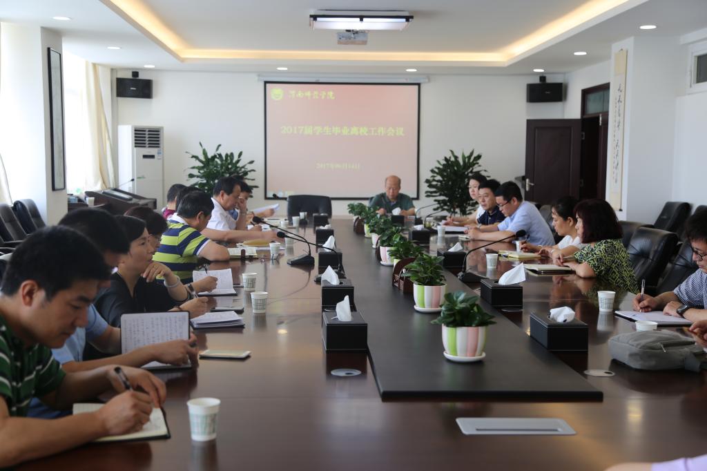 6月14日上午,我校2017届学生毕业离校工作会议在厚德楼第二会议室召开。校党委副书记赵伏友出席会议并讲话。学工部、招就处、教务处、组织部、宣传部、党政办、稳定办、人事处、计财处、保卫处、科技发展集团、图书馆、团委等相关部门领导、各二级学院党总支(分党委)书记参加会议。会议由学工部副部长田耿辉主持。