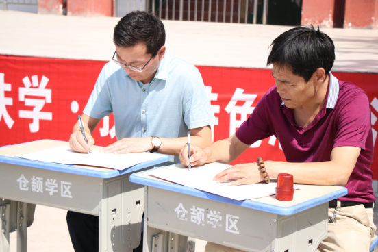 随后,我校团委副书记姚明亮和白水县仓颉学区党支部书记李江虎共同签署《共建大学生社会实践基地协议书》。校党委副书记赵伏友和白水县教育局党委办主任张向智为我校在白水县建立的第一个大学生社会实践基地揭牌。社会实践团队长闫保文同学作发言,他承诺实践队既向仓颉学区的孩子们传授知识,又积极关注孩子们的心灵成长,努力完成“扶学·扶志”支教活动。仓颉学区李耀强主任代表学校进行了讲话,他对我校大学生来到仓颉学区支教实践表示欢迎,对实践支教活动的形式和内容给予肯定,希望实践团队的全体同学能够发挥各自所长,带给学区孩子们不同的暑期体验。
