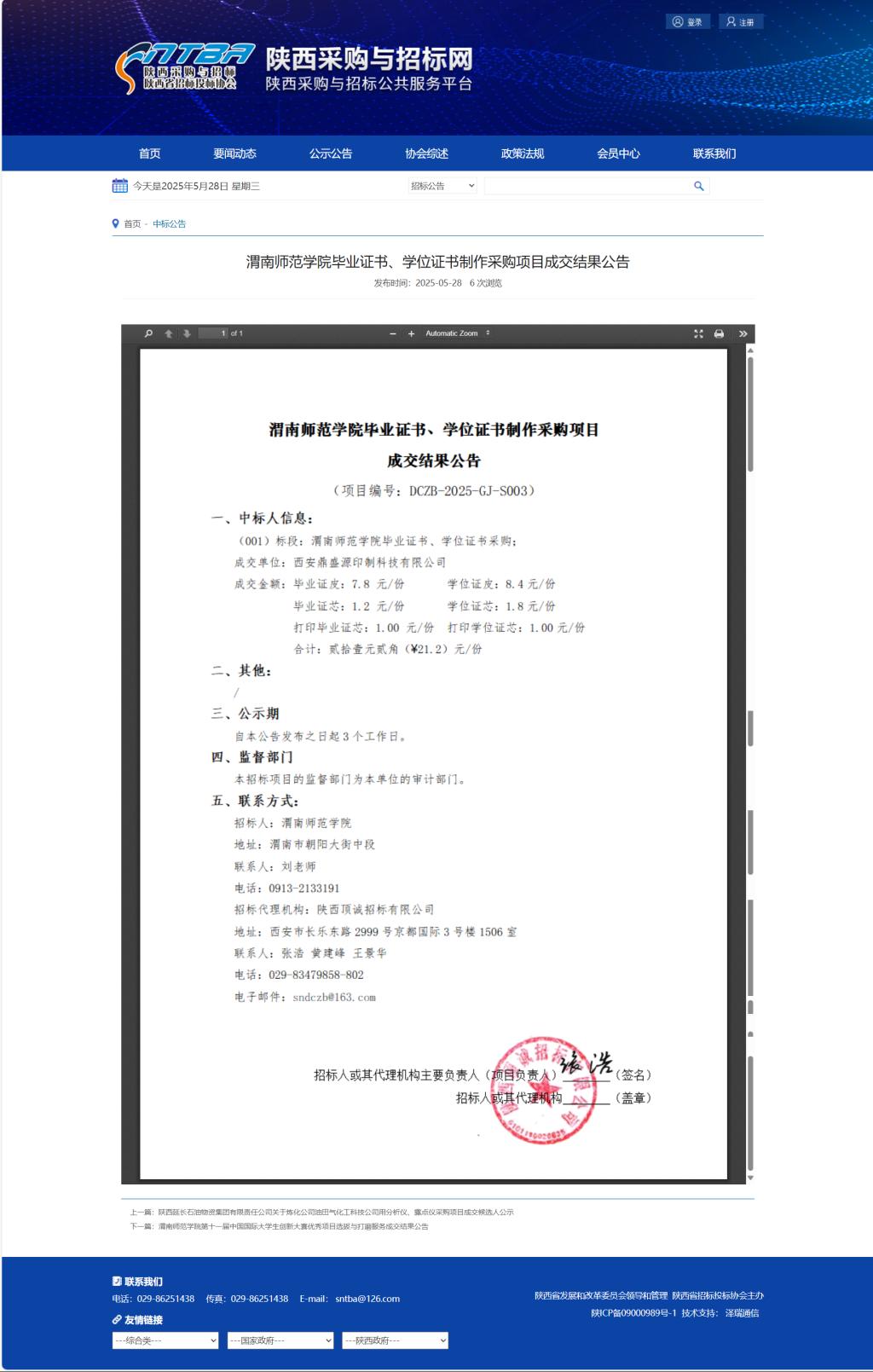 渭南师范学院毕业证书、学位证书制作采购项目成交结果公告