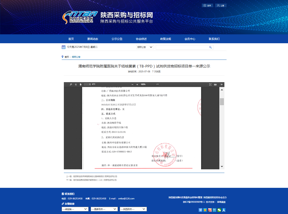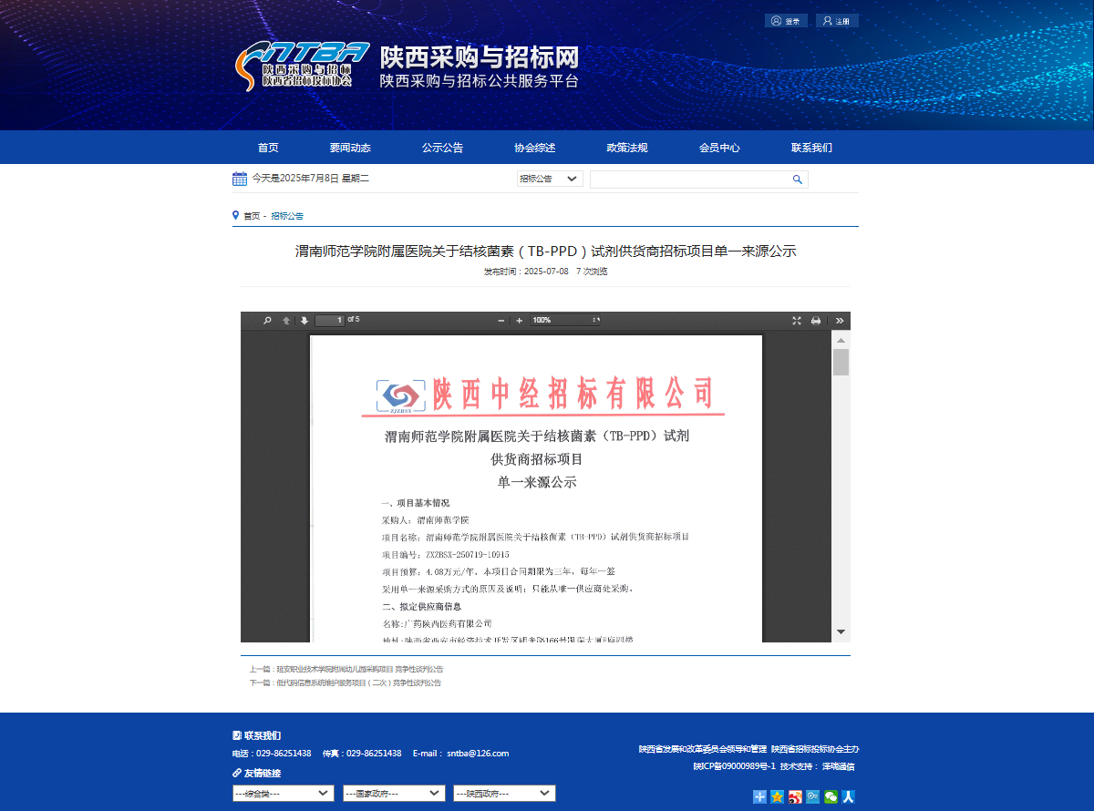 渭南师范学院附属医院关于结核菌素(TB-PPD)试剂供货商招标项目单一来源公示