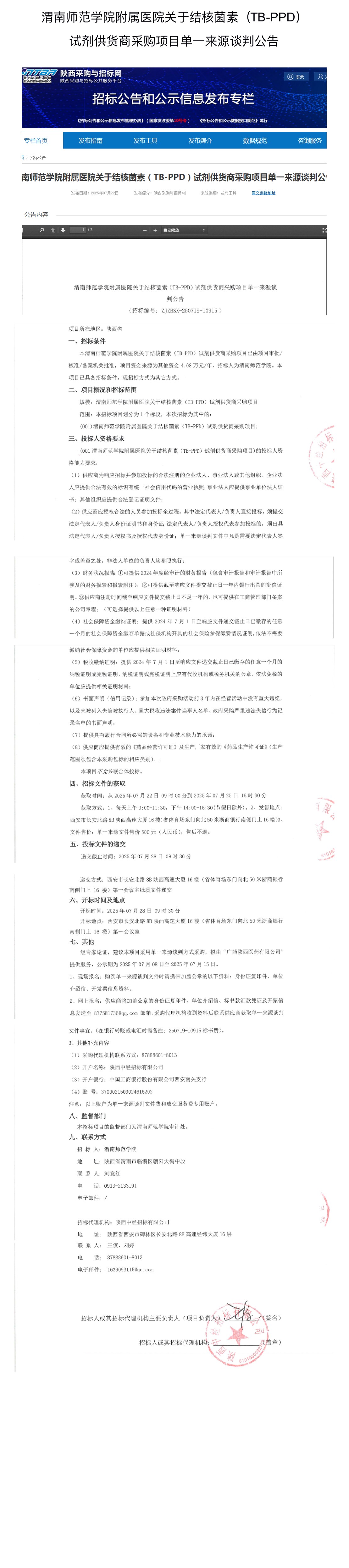渭南师范学院附属医院关于结核菌素(TB-PPD) 试剂供货商采购项目单一来源谈判公告