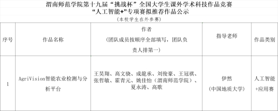 正文内容:根据《第十九届“挑战杯”全国大学生课外学术科技作品竞赛“人工智能+”专项赛通知》及有关赛程安排,《AgriVision智能农业检测与分析平台》拟经中国地质大学(北京)推荐参加第十九届“挑战杯”全国大学生课外学术科技作品竞赛“人工智能+”专项赛。我校教育科学学院2021级本科生姚佳怡(学号:210243036)为该项目团队成员。现将该项目的具体信息公示如下: