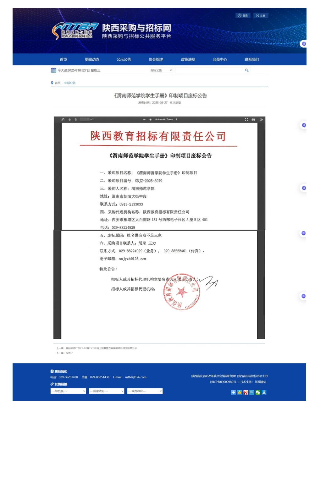 《渭南师范学院学生手册》印制项目(二次) 谈判公告