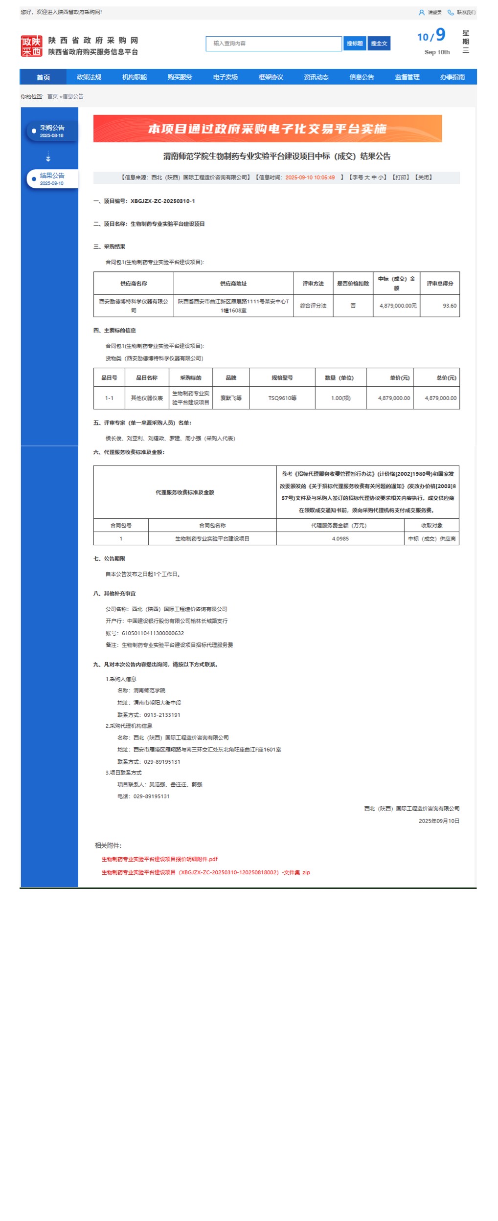 渭南师范学院生物制药专业实验平台建设项目中标(成交)结果公告