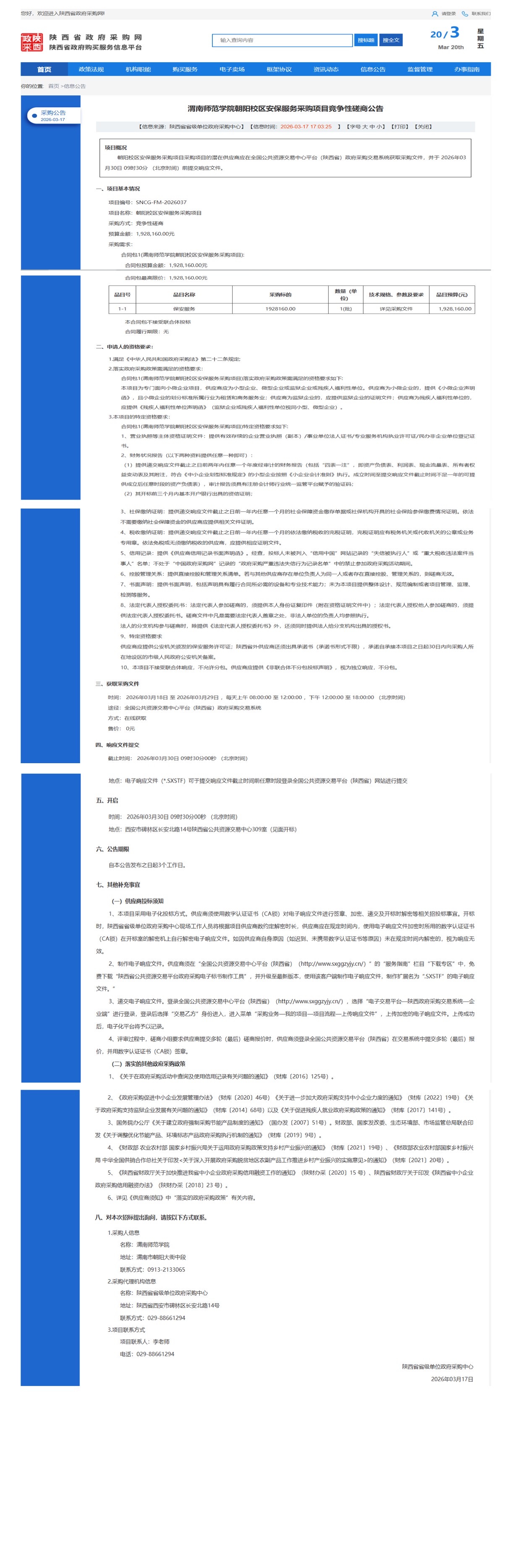 渭南师范学院朝阳校区安保服务采购项目竞争性磋商公告