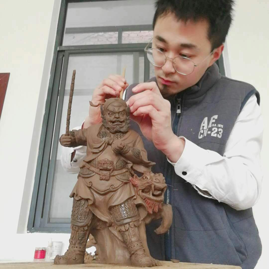 周少平,传媒学院2010级动画专业优秀毕业生,疫情发生前他正与传媒学院动画创作团队一起创作仓颉卡通形象,疫情发生后,他停下手头工作,精心创作《五瘟使者》和《守护者》两件泥塑作品。《五瘟使者》塑造的是保佑人们不染瘟疫的五瘟使者,作品富有民间传统造像特色,造型浑厚简练,粗犷夸张,表达出抗击疫情的决心和力量。