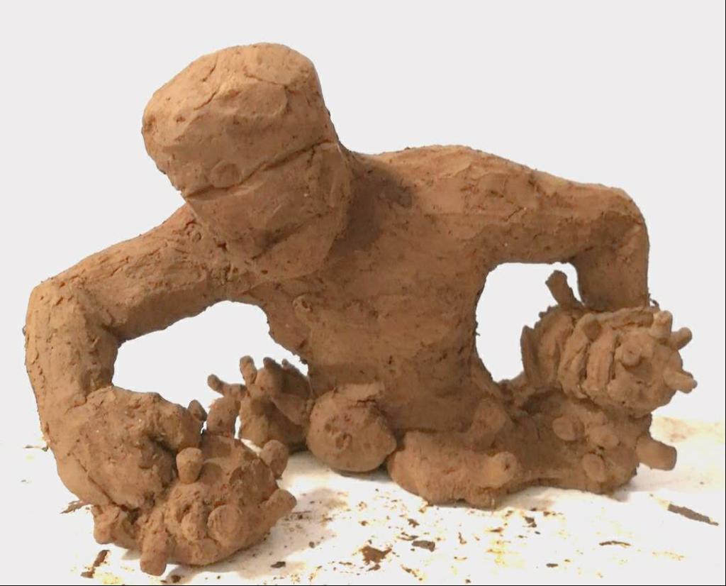 《守护者》是另一件泥塑作品,虽然还没有完全成型,但其轮廓清晰地展示出医护形象对抗疫情的框架——一只手打压病毒,另一只手将病毒捏碎,展现出医护工作者的奉献精神和强大力量,表达出民间文艺工作者对奋战在抗疫前线医护人员的敬意。