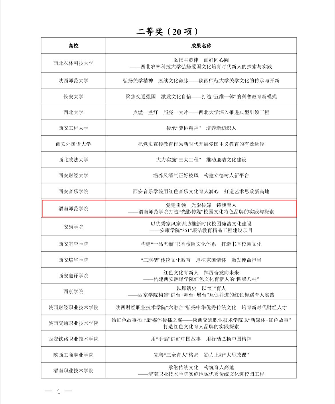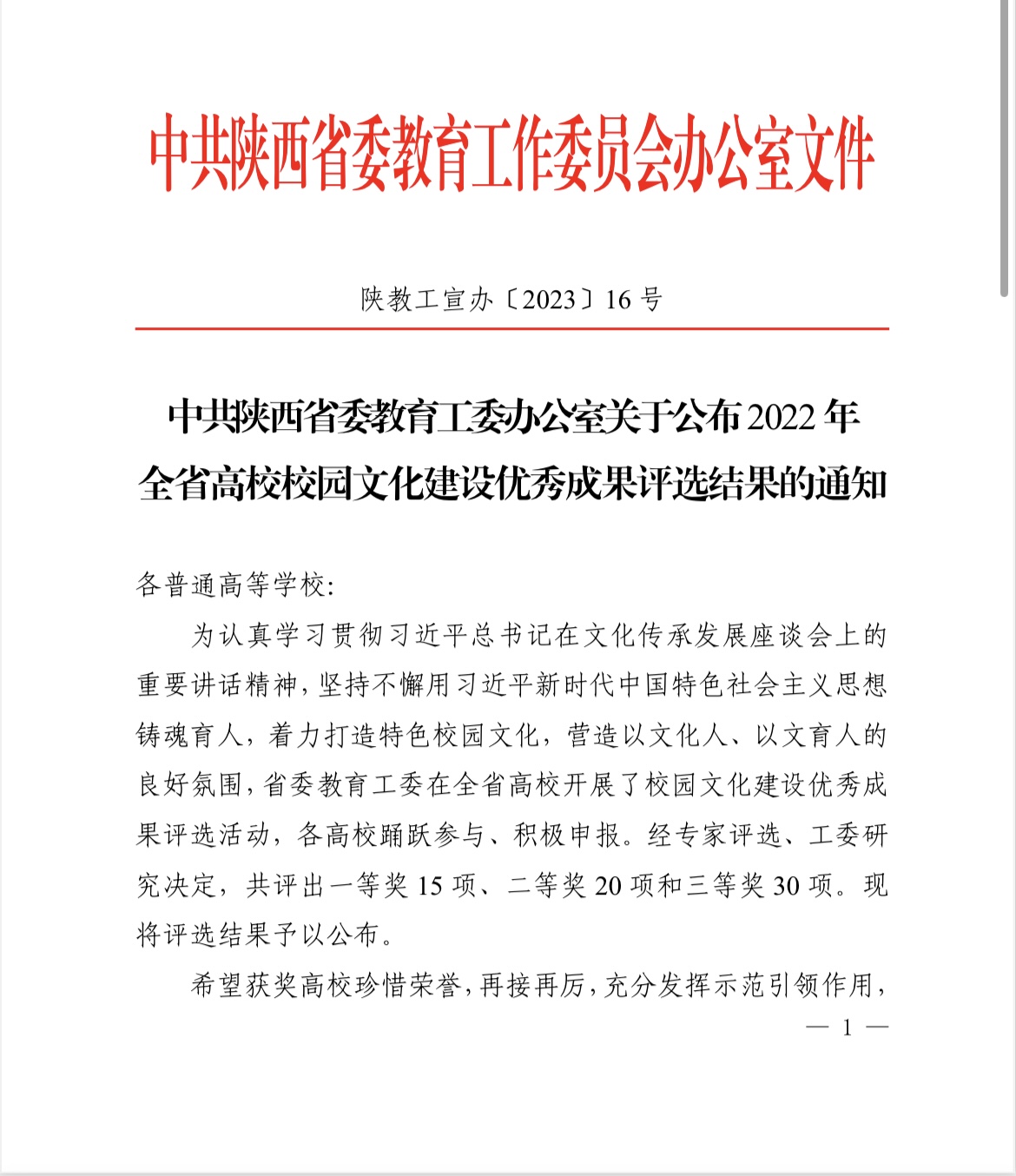 近日,中共陕西省委教育工委发文通报表彰2022年全省高校校园文化建设优秀成果奖,经学校宣传部评选推荐、传媒学院申报的《党建引领 光影传媒 铸魂育人——渭南师范学院打造“光影传媒”校园文化特色品牌的实践与探索》成果荣获二等奖。