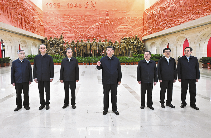 新华社延安10月27日电 党的二十大闭幕不到一周,中共中央总书记、国家主席、中央军委主席习近平带领中共中央政治局常委李强、赵乐际、王沪宁、蔡奇、丁薛祥、李希,专程从北京前往陕西延安,瞻仰延安革命纪念地,重温革命战争时期党中央在延安的峥嵘岁月,缅怀老一辈革命家的丰功伟绩,宣示新一届中央领导集体赓续红色血脉、传承奋斗精神,在新的赶考之路上向历史和人民交出新的优异答卷的坚定信念。习近平强调,要弘扬伟大建党精神,弘扬延安精神,坚定历史自信,增强历史主动,发扬斗争精神,为实现党的二十大提出的目标任务而团结奋斗。