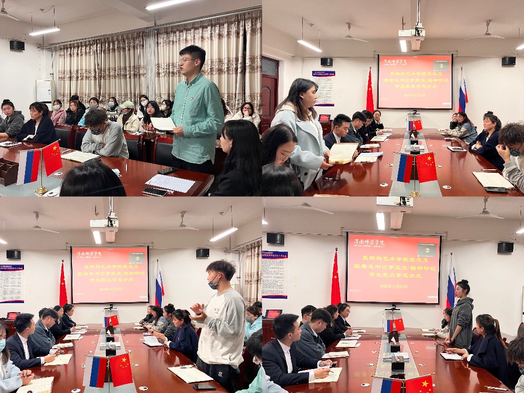 11月23日晚,莫斯科艺术学院举办“跟着总书记学党史·精神印记”学生党员学思沙龙活动第二期。学院党总支书记孟波、党总支副书记叶晓燕、全体专职辅导员、学生党员、发展对象及积极分子线上线下参加。