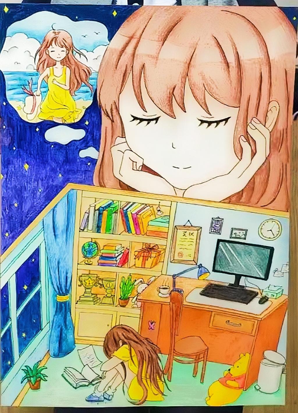 作品释义:我有好多奖状,有好多奖杯,还有好多好多荣誉证书。但是我并不快乐,因为这些都不是我想要的。我想要什么呢?我想要海风吹拂头发,我想要阳光照耀肌肤,我想要穿着漂亮小裙子在海边自由奔跑。可是,现在我只能学习。