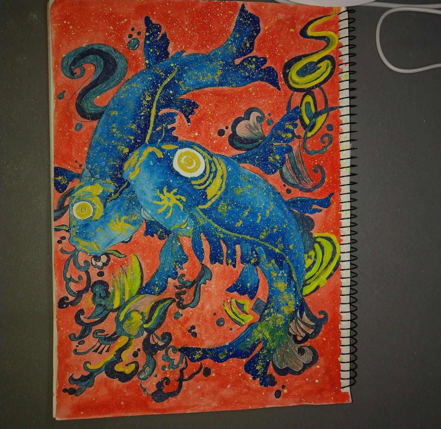 作品释义:该绘画作品以弗洛伊德的“自我和超我”为理论依据画出两条交缠的鱼一条喻为理想自我,另一条喻为现实自我。鱼的交缠实际是现阶段大学生对前途的选择,两条鱼也有对未来美好的象征,整幅画色调饱和,展现出即使会有迷茫却依旧积极向前。