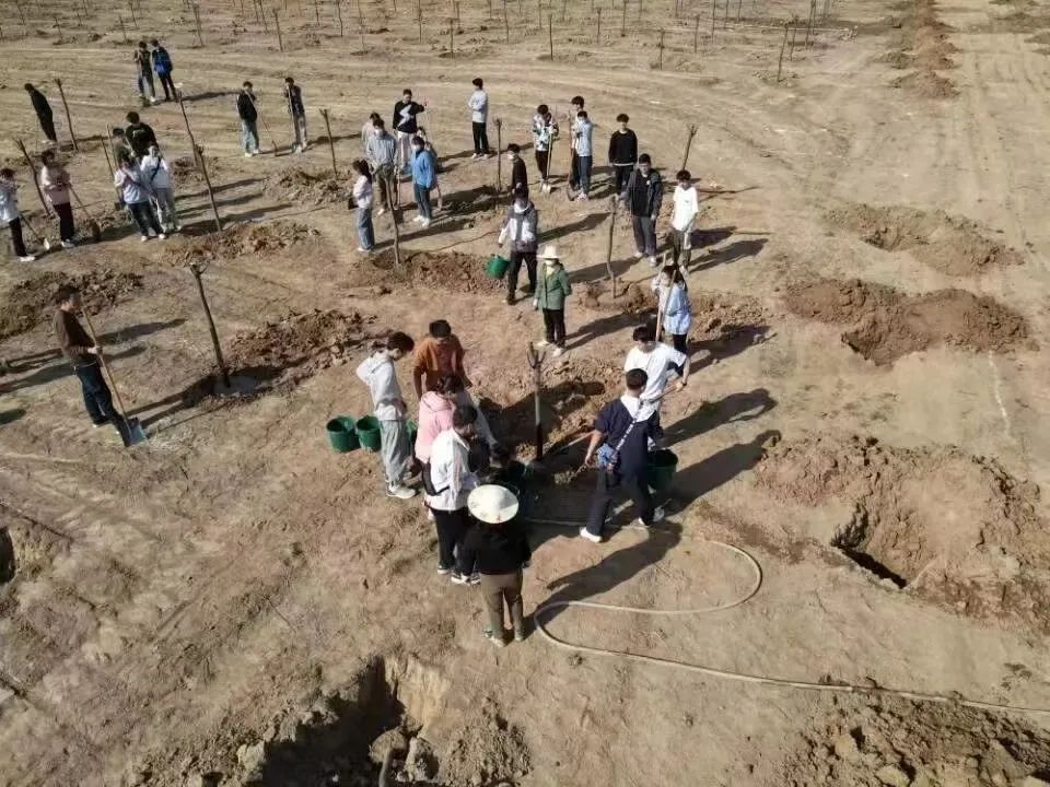 植树现场,学院领导带领参与植树的师生进行分工协作,大家热情洋溢、干劲十足。两三人一组互相配合,挖坑、植树、浇水、覆土、固定、手起锄落、放苗回填、提水浇灌……整个过程一丝不苟;各个环节衔接有序、配合默契,齐心合力栽下一棵棵树苗。经过一番辛勤的劳动,棵棵新树昂首挺立,为校园再添新绿。
