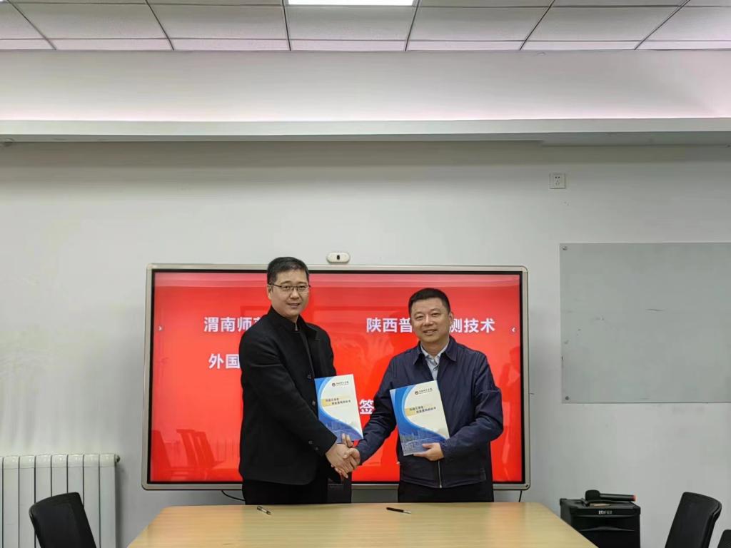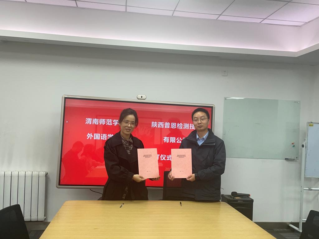 3月24日上午,外国语学院与陕西普恩检测技术有限公司校地合作签约仪式在陕西省西安市国家级民用航天基地众创广场举行。陕西普恩检测技术有限公司总经理张跃军、副总经理李鹏、我校科学研究处计划项目科科长杨春丽、外国语学院党总支副书记、副院长高军强、副院长李圣恩等人出席本次签约仪式。