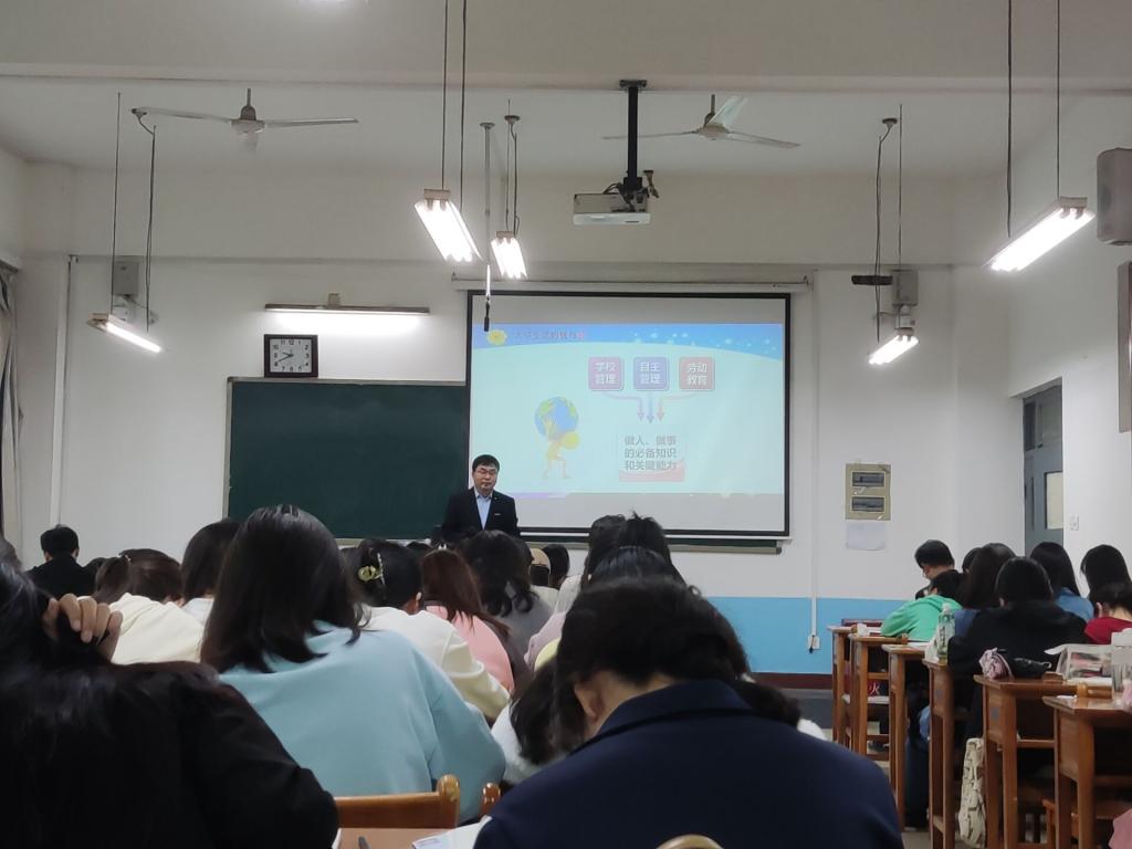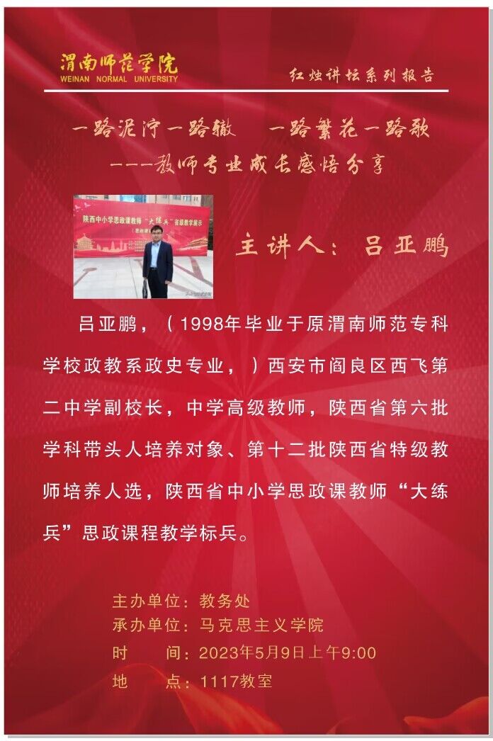 5月9日是渭南师范学院成立63周年的校庆日,马克思主义学院邀请思想政治教育专业的优秀校友、西安市阎良区西飞二中正高级教师、陕西省首届中小学“思政课”教师大练兵教学标兵吕亚鹏作了题为《一路泥泞一路辙 一路繁花一路歌》的专题报告。思政专业负责人曹立新等教师与2021级百余名学生参加。报告会由副院长单剑峰主持。