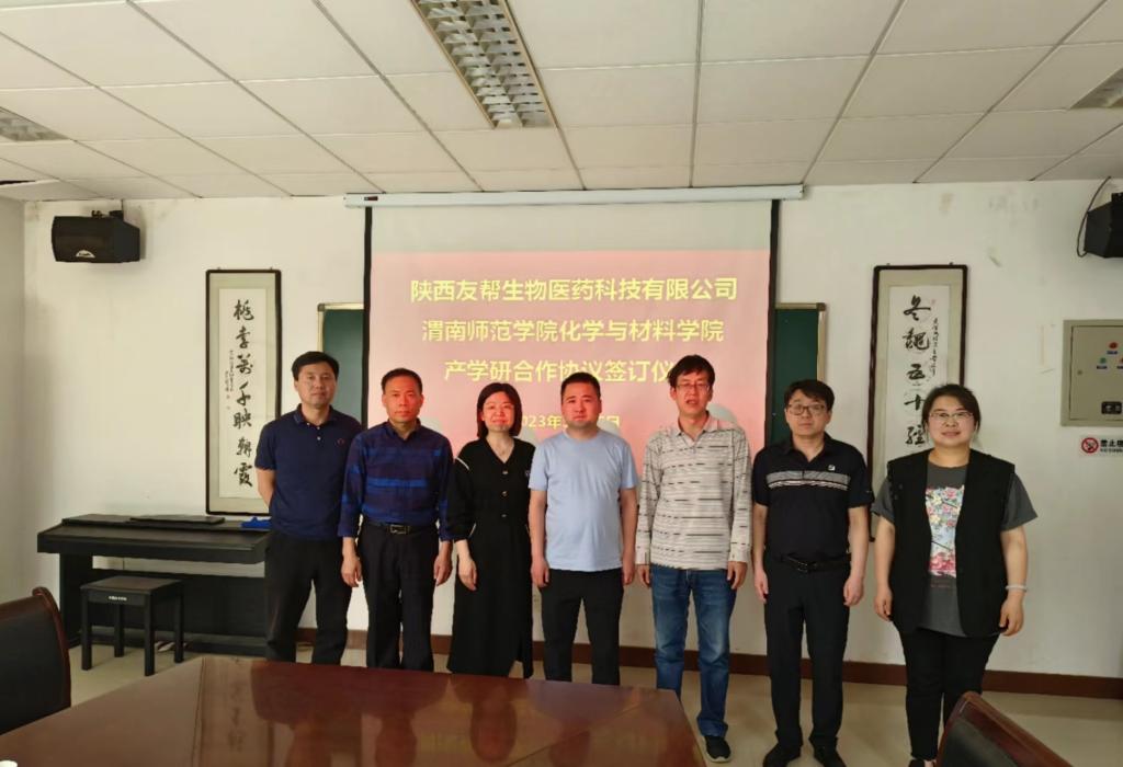 5月15日下午,化学与材料学院与陕西友帮生物医药科技有限公司举行产学研合作协议签订仪式。学院党委书记韩城忠、院长焦更生、副书记任晓婷、副院长刘展晴、副院长王冬华,陕西友帮生物医药科技有限公司行政总经理郭飞、技术总监王振、人事部长蒙明珠共同参加了本次签订仪式。