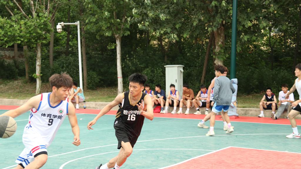 伴随着哨声响起,现场的气氛逐渐攀升,狭路相逢勇者胜,众多队伍之间很快进入了激烈的角逐。经历了数场淘汰赛后,物理与电气工程学院的“四个帅哥”队和体育学院的“飞龙在天”队展开了冠亚军的争夺。场上球员们积极拼抢,在对方防线内拼杀,不断地运球、传球、投篮,赢得了现场观众的掌声。球员之间较量异常激烈,场下观众的氛围也十分热烈,全场气氛达到了一个高潮。比赛双方有着惊人的默契配合,发挥各自的优势突破对方的重重包夹,精确的将球送入篮筐。他们任汗水流淌湿透球服,脚步坚定从不停歇,在场观众也悬着一颗热烈而激动的心为他们加油打气。