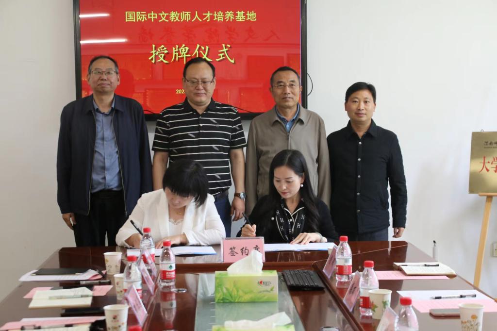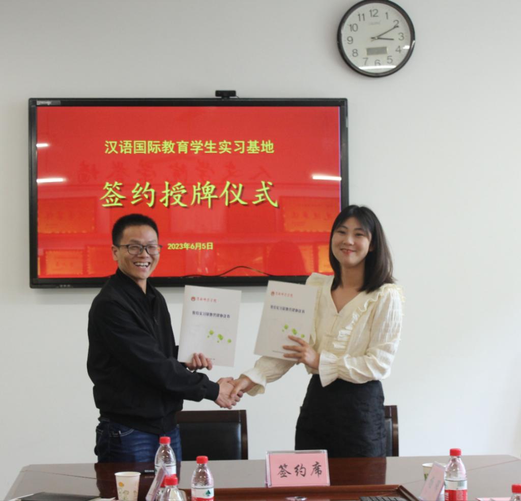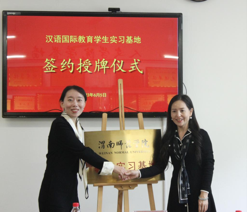人文学院党总支副书记、副院长张晶与陕西省汉语国际教育研究会签订了《共建大学生就业基地协议书》,党总支书记李三岗授“大学生就业基地牌匾”。副院长雷炳锋与陕西省汉语国际教育研究会签订了《教育实习基地共建协议书》,延慧授“教育实习基地牌匾”。