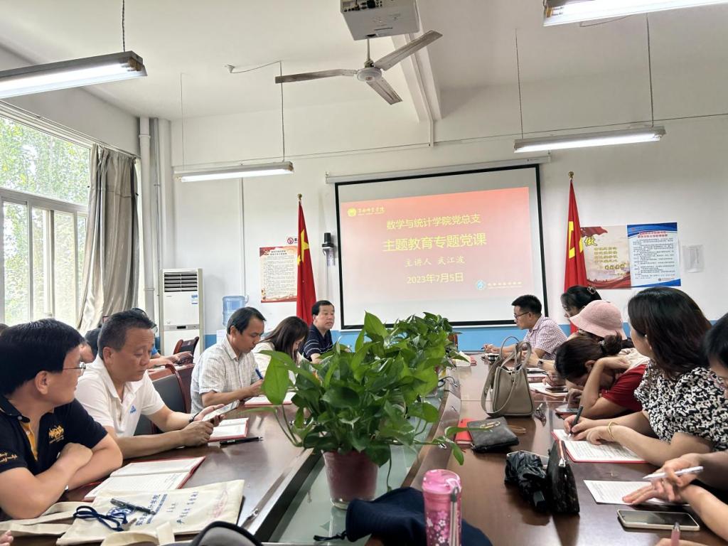 7月5日,数学与统计学院党总支在学院会议室开展主题教育专题党课活动,党总支书记武江波为全体教师党员讲授了以“全面学习领会习近平新时代中国特色社会主义思想 努力推进落实立德树人根本任务”为题的党课。