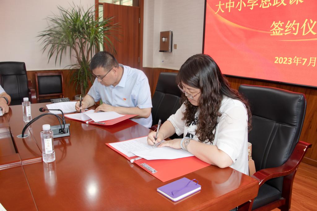 仪式上,张萍与郭高峰共同签署共建“大中小学思政课一体化建设基地”协议并举行揭牌仪式。