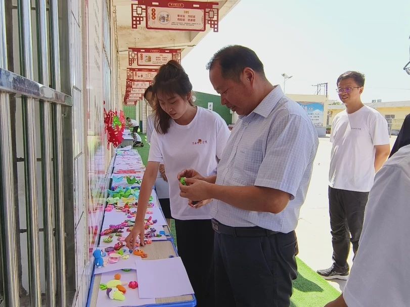 在王庄镇中心学校,汪勇一行和学生家长们共同参观了孩子们在支教课堂上制作的粘土和折纸作品、简笔画、硬笔字作品展等。汪勇仔细翻阅实践队队员的工作手册和实践记录,详细询问了课堂教学有关情况,并对支教活动取得的良好效果给予了充分肯定,希望大家能结合自身专业知识,通过开展知识科普、党史教育、趣味活动等,给孩子们的童年种下梦想的种子。