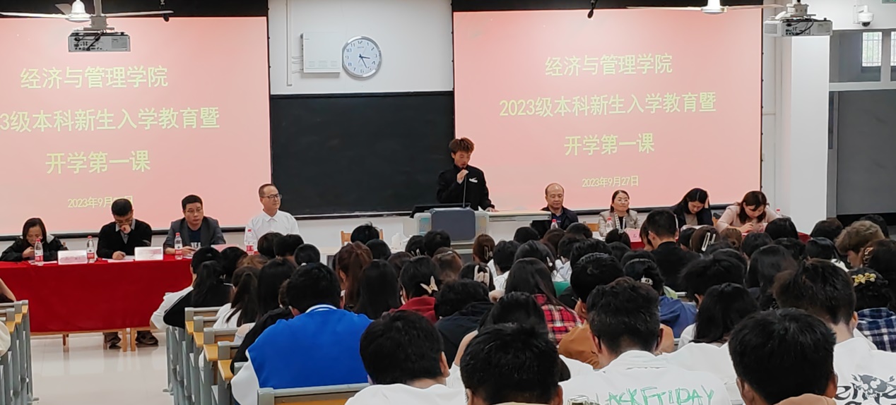 9月27日下午,经济与管理学院在富平校区130教室举行了2023级本科新生入学教育暨开学第一课。学院全体班子成员、富平校区辅导员以及197名新生参加了此次典礼。入学教育由党总支副书记谢稷光主持。