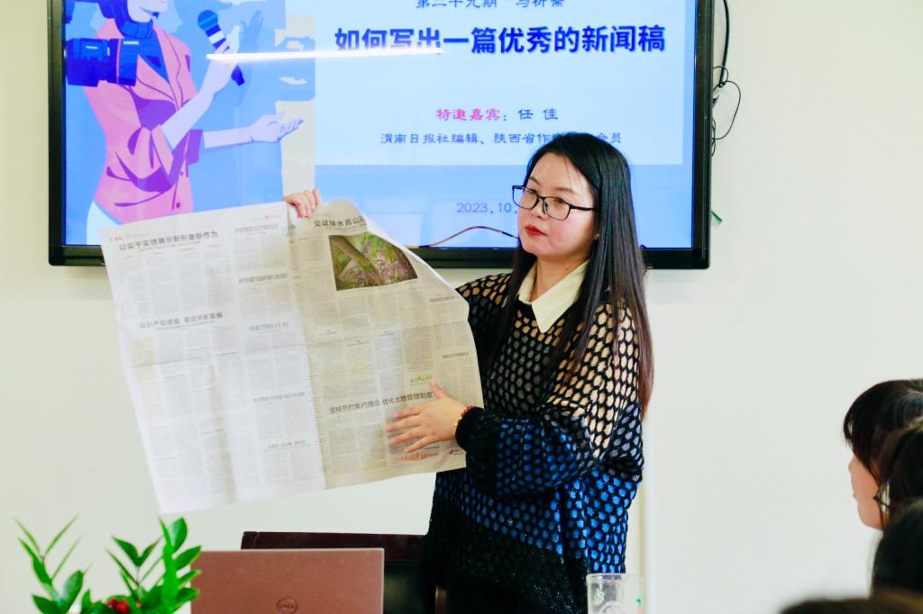 接下来,任佳从三个方面回答了“如何写出一篇优秀的新闻稿”这一问题。一是要注重创作过程,“脚上沾有多少泥土,心中就沉淀多少真情”,要深入现场、仔细观察、注意细节,做到有故事、有温度、有线索。二是要注重作品亮点,提升新闻敏感性。选题上要以“小切口体现大主题”,标题是报道的眼睛,要做到准确简洁、亮点突出、反映核心。三是注重后期处理,要做到认真修改、精益求精。答疑过程中,任佳以《好新闻的样子》《渭南日报》为例,解析如何提炼标题、如何做好后期修改润色,并现场指导同学们对两篇新闻报道进行了修改。
