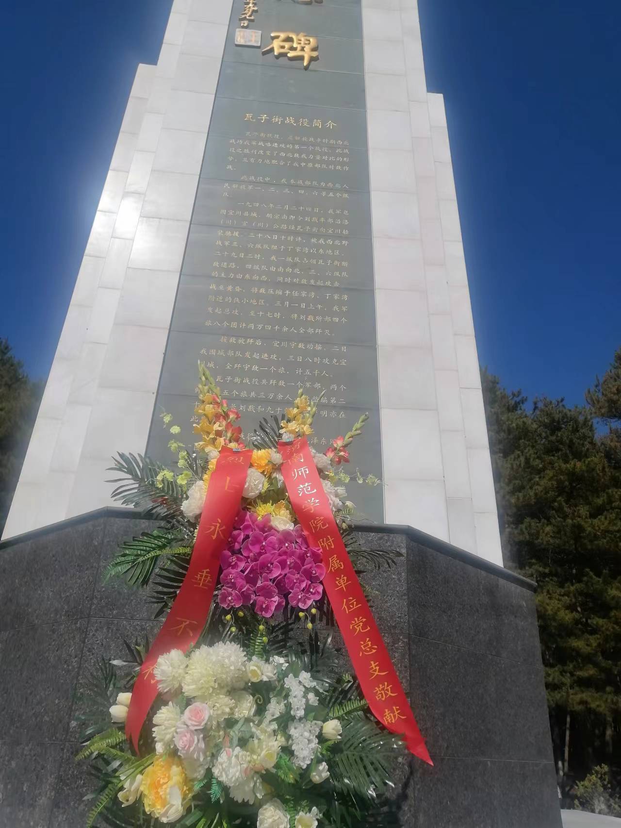 在高耸立入云的瓦子街战役烈士纪念碑前,全体党员怀着无比崇敬的心情敬献了花篮,向烈士们三鞠躬。并向党旗庄严宣誓,铭记入党初心。