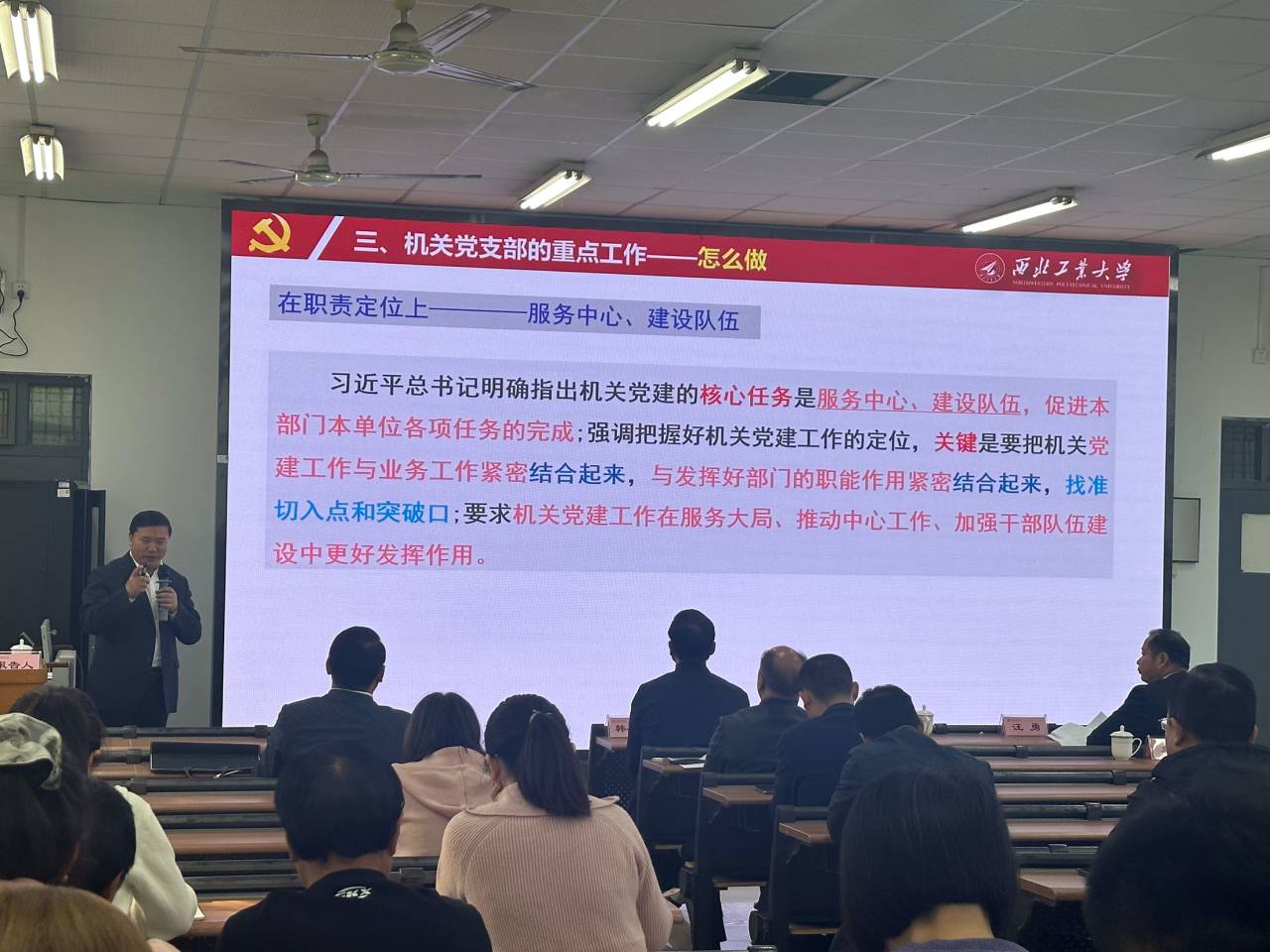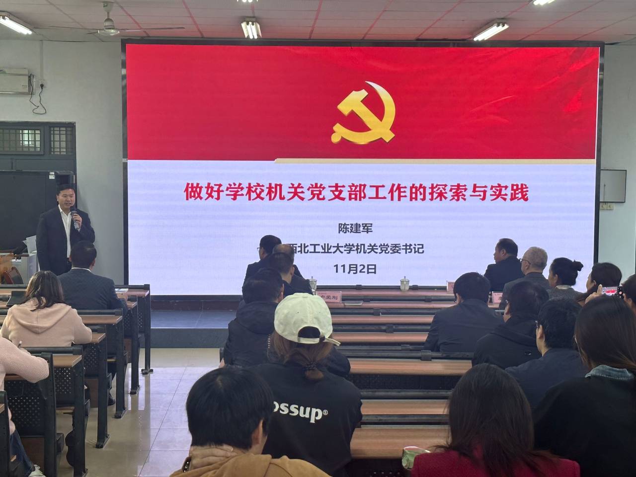 11月2日上午,西北工业大学机关党委书记陈建军应邀到我校以《做好学校机关党支部工作的探索与实践》为题作专题报告。报告会由机关党委书记董康军主持,学校领导与机关党员干部和机关各支部结对共建的二级学院师生融合党支部委员、党员代表等90余人参加报告会。