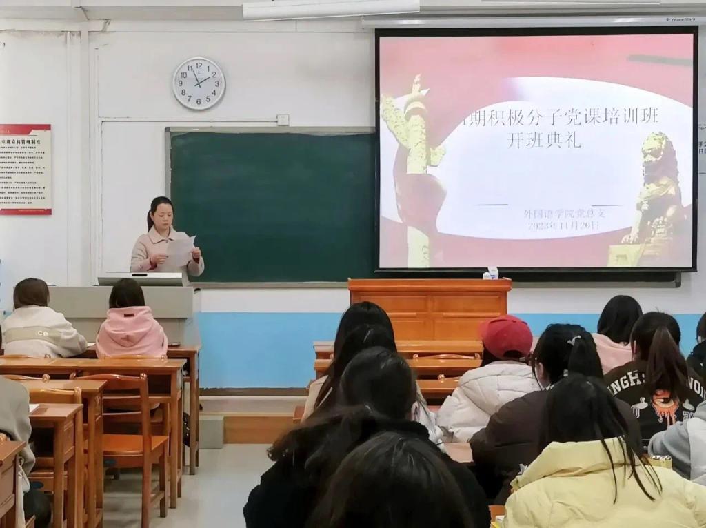 11月20日下午,外国语学院举行第74期入党积极分子培训班开班仪式。学院党总支书记吕健、党总支副书记高军强、学工办副主任敬菲菲、全体辅导员及55名积极分子参加了开班仪式,会议由许艳老师主持。
