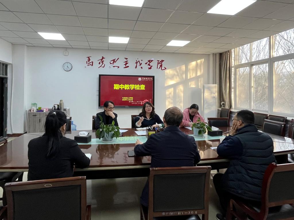 为全面了解本学期教学开展情况、教学改革进展情况,及时发现并解决存在的问题,教务处组织了2023学年秋季学期期中教学检查工作。教务处处长孙宏恩、教学科科长侯永广、李琦老师于11月23日下午莅临马克思主义学院开展期中教学检查工作。院长张萍、副院长单剑峰、教学秘书张江婷和思政课教师孙蓉蓉参加了此次检查会。