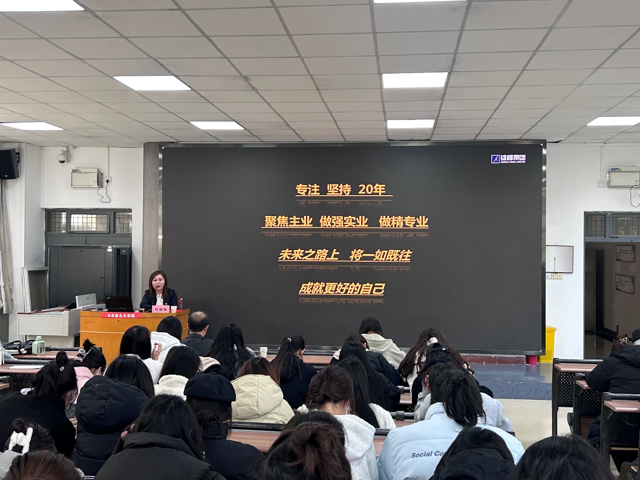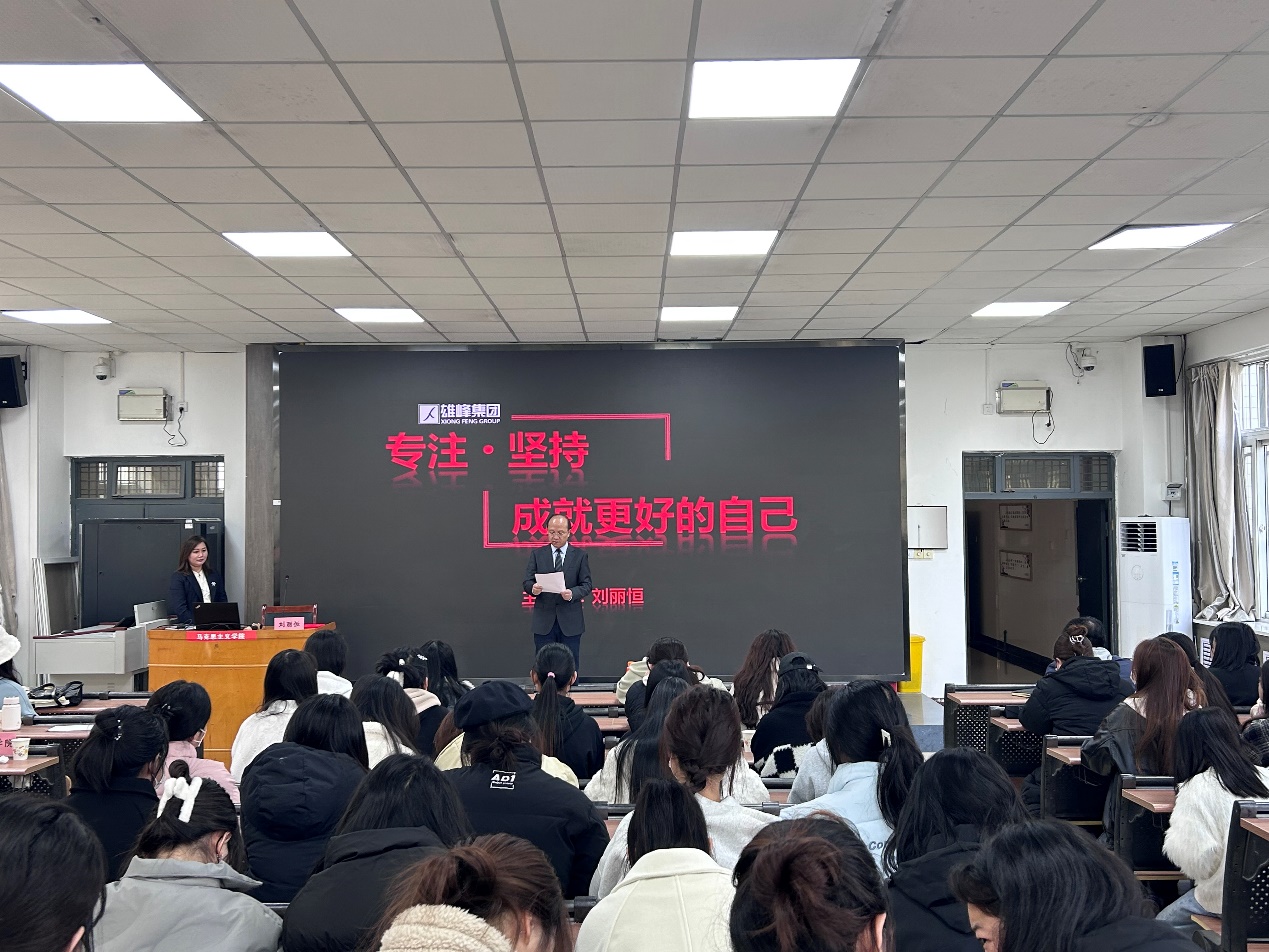11月22日上午,经济与管理学院邀请全国“三八红旗手”、陕西雄峰实业集团有限公司总经理刘丽恒在1101教室为作主题为《专注·坚持 成就更好的自己》的报告分享会。报告会由经济与管理学院院长李富荣主持,2023级市场营销、会计学、财务管理三个专业的120名学生参加会议。
