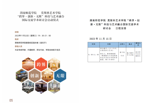 为贯彻落实习近平总书记在党的二十大报告中提出的“实施科教兴国战略,强化现代化建设人才支撑”及“推进文化自信自强,铸就社会主义文化新辉煌”指示精神,更好地推动文化艺术和科技深度融合,全面提升文化艺术与科技的协同创新能力。“跨界·创新·无限”科技与艺术融合国际交流学术研讨会于2023年11月22日至24日在我校召开。本次会议由渭南师范学院与俄罗斯莫斯科国立师范大学主办,渭南师范学院莫斯科艺术学院、俄罗斯莫斯科国立师范大学俄中统筹中心、陕西省“一带一路”艺术教育引智基地承办;参会专家为来自韩国、俄罗斯、泰国、马来西亚等国著名高校的专家学者。会议召开采取分段式进行,以学术论坛、研讨会、报告会等多种形式开展,采用“主会场+平行分会场”、“线下+线上”的方式召开。