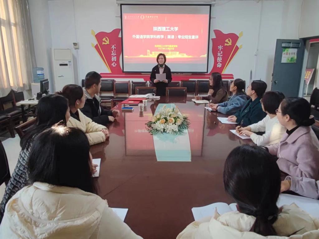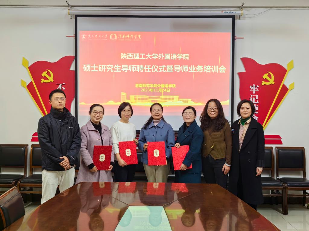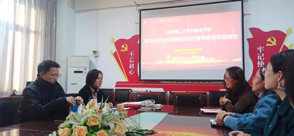 11月24日下午,受陕西理工大学外国语学院院长余丽委托,陕西理工大学外国语学院研究生秘书崔敏、邓朝路一行在我校外国语学院主持召开了陕西理工大学硕士研究生导师聘任仪式暨导师业务培训会,我校外国语学院院长李海荣及受聘教师出席了此次活动。